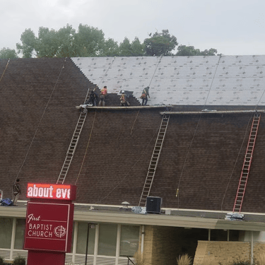 Explore Goad Construction's impressive before and after roof project for the First Baptist Church. Discover how we transformed their roof, ensuring durability and aesthetic appeal. See the stunning results of our roof project today! We cover all roofing needs for churches.